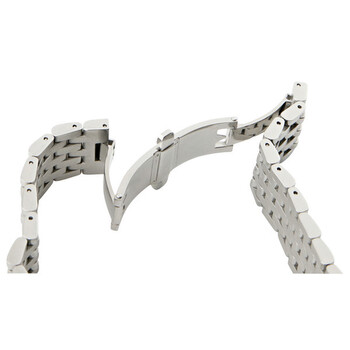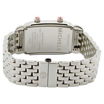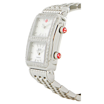 Stainless steel case and bracelet. Dual white mother-of-pearl dials. Bezel set with 117 diamonds. Scratch resistant sapphire crystal. Case diameter 27mm. Quartz movement. Water resistant at 50 meters (165 feet). Michele Deco Park Dual Time Diamond Ladies Watch MWW06S000001
