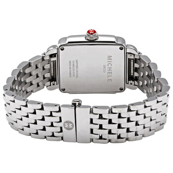 Stainless steel case with a stainless steel bracelet. Fixed stainless steel bezel. White sunray (diamond-set) dial with luminous silver-tone hands and Roman numeral hour markers. Dial Type: Analog. Luminescent hands. Date display at the 6 o'clock position. Quartz movement. Scratch resistant sapphire crystal. Solid case back. Rectangle case shape. Case dimensions: 29 mm x 31 mm. Case thickness: 8.5 mm. Band width: 16 mm. Deployment clasp with a push button release. Water resistant at 50 meters / 165 feet. Functions: date, hour, minute, second. Additional Info: set with 40 diamonds (0.10 ct). Luxury watch style. Watch label: Swiss Made. Michele Deco Quartz White Dial Ladies Watch MWW06G000012.