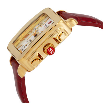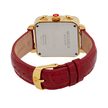 Gold-tone stainless steel case with a red leather strap. Fixed gold-tone stainless steel bezel. Silver dial with gold-tone hands and index-Roman numeral hour markers. Dial Type: Analog. Luminescent hands and markers. Chronograph - three sub-dials displaying: 60 second, 30 minute and 24 hour. Quartz movement. Scratch resistant mineral crystal. Pull / push crown. Solid case back. Rectangle case shape, case size: 36 mm. Band width: 18 mm. Buckle clasp. Water resistant at 50 meters / 165 feet. Functions: chronograph, hour, minute, second. Deco Sport Series. Sport watch style. Watch label: Swiss Made. Michele Deco Sport Chronograph Quartz Silver Dial Ladies Watch MWW06K000065.