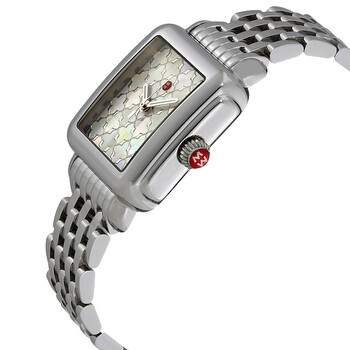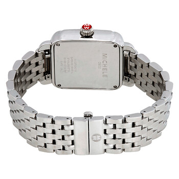 Silver-tone stainless steel case with a silver-tone stainless steel bracelet. Fixed stainless steel bezel. White mother of pearl mosaic dial with silver-tone hands. Dial Type: Analog. Quartz movement. Scratch resistant sapphire crystal. Solid case back. Rectangle case shape. Case size: 33 mm x 35 mm. Band width: 18 mm. Water resistant at 50 meters / 165 feet. Functions: hour, minute, second. Additional Info: interchangeable with any 18mm michele strap. Dress watch style. Watch label: Swiss Made. Michele Deco White Mother of Pearl Mosaic Dial Ladies Watch MWW06T000175.