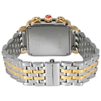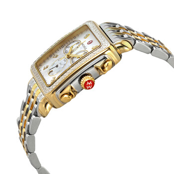 Silver-tone stainless steel case with a two-tone (silver-tone and yellow gold-tone) stainless steel bracelet. Fixed yellow gold-tone stainless steel set with diamonds bezel. Mother of pearl dial with lumiunous yellow gold-tone hands and diamond hour markers. Minute markers around the outer rim. Dial Type: Analog. Luminescent hands and markers. Date display at the 6 o'clock position. Two sub-dials displaying: 60 second and 30 minute. day of the week. Quartz movement. Scratch resistant sapphire crystal. Pull / push crown. Solid case back. Rectangle case shape, case size: 36 mm x 37.5 mm. Band width: 20 mm. Deployment with push button release clasp. Water resistant at 50 meters / 165 feet. Functions: chronograph, day, date, hour, minute, second. Deco Xl Series. Dress watch style. Watch label: Swiss Made. Michele Deco XL Chronograph Quartz Diamond Ladies Watch MWW06Z000034.