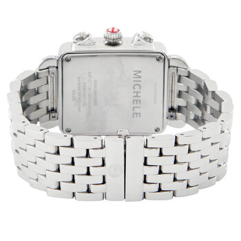 Stainless steel case with a silver-tone stainless steel bracelet. Fixed silver-tone bezel with 120 diamond set. Silver with mother of pearl sub-dials dial with luminous hands and stick hour markers. Minute markers around the outer rim. Dial Type: Analog. Luminescent hands and dial markers. Date display at the 6 o'clock position. Chronograph - three sub-dials displaying: 60 second, 30 minute and 1/10th of a second. Quartz movement. Scratch resistant sapphire crystal. Solid case back. Rectangle case shape, case size: 45 mm x 37 mm, case thickness: 11.5 mm. Band width: 20 mm, band length: ladies standard. Deployment clasp. Water resistant at 50 meters / 165 feet. Functions: second, chronograph, date, hour, minute. Additional Info: 120 hand-set white diamonds (~0.67 caret), chronograph. Deco Series. Fashion watch style. Watch label: Swiss Made. Item Variations: MWW 06J000008, MWW-06J000008, MWW/06J000008, 06J000008. Michele Deco XL Diamond Ladies Watch MWW06J000008.