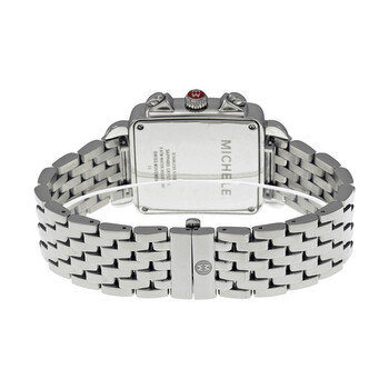Stainless steel case with a stainless steel bracelet. Fixed silver-tone bezel set with diamonds. Mother of pearl dial with silver-tone hands and diamond index hour markers. Minute markers around the outer rim. Dial Type: Analog. Luminescent hands. Date display at the 6 o'clock position. Quartz movement. Scratch resistant sapphire crystal. Solid case back. Case dimensions: 36.5 mm x 38 mm. Rectangle case shape. Band width: 20 mm. Deployment with push button clasp. Water resistant at 50 meters / 165 feet. Functions: chronograph, date, hour, minute, second. Luxury watch style. Watch label: Swiss Made. Michele Deco XL Mother of Pearl Stainless Steel Ladies Watch MWW06Z000001.