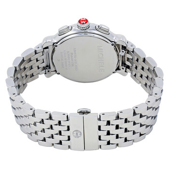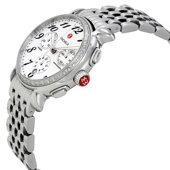 Stainless steel case with a stainless steel bracelet. Fixed silver-tone bezel set with diamonds. Silver white dial with silver-tone hands and Arabic numeral hour markers. Minute markers around the outer rim. Dial Type: Analog. Luminescent hands and markers. Date display at the 6 o'clock position. Chronograph - three sub-dials displaying: 60 second, 30 minute and 1/10th of a second. Swiss quartz movement. Scratch resistant sapphire crystal. Pull / push crown. Solid case back. Case diameter: 38 mm. Round case shape. Band width: 18 mm. Deployment clasp with push button. Water resistant at 50 meters / 165 feet. Functions: chronograph, date, hour, minute, second. Dress watch style. Michele Fluette Diamond Chronograph Stainless Steel Ladies Watch MWW24A000001.