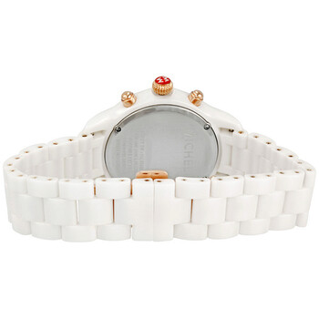 White ceramic case with a white ceramic bracelet. Fixed rose gold-tone bezel set with 112 diamonds. White enamel dial with gold-tone hands and stick hour markers. Arabic numerals mark the 4, 8 and 12 o'clock positions. Luminescent hands and markers. Date display appears at the 6 o'clock position. Chronograph - three sub-dials displaying: 60 seconds, 30 minutes and 1/10th of a second. Swiss movement. Scratch resistant sapphire crystal. Solid case back. Case diameter: 39 mm. Deployment clasp. Water resistant at 50 meters / 165 feet. Functions: chronograph, date, hour, minute, second. Michele Jetway Diamond Ceramic Chronograph Ladies Watch MWW17B000008.