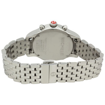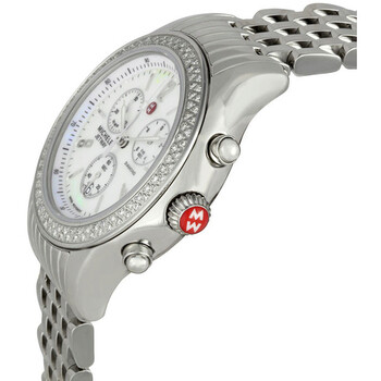 Stainless steel case with a stainless steel bracelet. Fixed bezel set with diamonds bezel. Mother of pearl dial with silver-tone hands and index hour markers. Arabic numeral marks the 12 o'clock position. minute markers around the outer rim. Dial Type: Analog. Date displays at the 6 o'clock position. Chronograph - three sub-dials displaying: 1/10th seconds, 30 minutes, 60 seconds sub dials. Quartz movement. Scratch resistant sapphire crystal. Solid case back. Case diameter: 39 mm. Round case shape. Deployment clasp. Water resistant at 50 meters/ 165 feet. Functions: hours, minutes, seconds, date, chronograph. Sport watch style. Watch label: Swiss Made. Michele Jetway Mother of Pearl Dial Diamond Bezel Ladies Watch MWW17A000001.