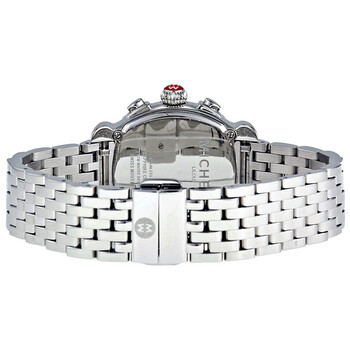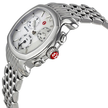 Stainless steel case with a stainless steel bracelet. Fixed stainless steel bezel. Mother of pearl dial with silver-tone hands and stick hour markers. Arabic numerals mark the 3, 9 and 12 o'clock positions. Dial Type: Analog. Luminescent hands and markers. Date display appears at the 6 o'clock position. Day of the week sub-dial. Chronograph - two sub-dials displaying: 60 second and 30 minute. Quartz movement. Scratch resistant sapphire crystal. Solid case back. Case dimensions: 32 mm x 33 mm. Tonneau case shape. Band width: 16 mm. Deployment clasp with push button. Water resistant at 50 meters / 165 feet. Functions: chronograph, day, date, hour, minute, second. Dress watch style. Michele Lilou Chronograph Mother of Pearl Dial Stainless Steel Ladies Watch MWW22A000006.