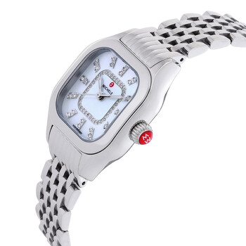 Silver-tone stainless steel case and bracelet. Fixed silver-tone stainless steel bezel. Mother of pearl dial with silver-tone hands and diamond hour markers. Dial Type: Analog. Quartz movement. Scratch resistant sapphire crystal. Cushion case shape, case size: 29 mm. Fold over clasp with a safety release. Water resistant at 50 meters / 165 feet. Functions: hour, minute, second. Meggie Series. Dress watch style. Watch label: Swiss Made. Michele Meggie Quartz Diamond Ladies Watch MWW33B000008.