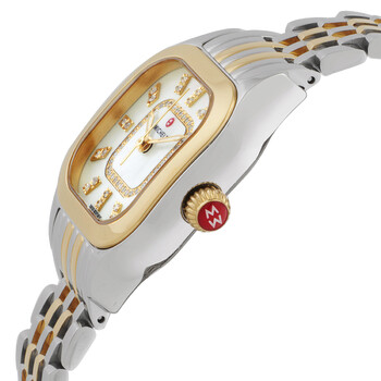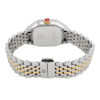 Silver-tone stainless steel case with a two-tone (silver-tone and yellow gold-tone) stainless steel bracelet. Fixed yellow gold-tone stainless steel bezel. Mother of pearl dial with yellow gold-tone hands and diamond hour markers. Dial Type: Analog. Quartz movement. Square case shape, case size: 29 mm. Fold over clasp with a safety release. Water resistant at 50 meters / 165 feet. Functions: hour, minute, second. Meggie Series. Casual watch style. Watch label: Swiss Made. Michele Meggie Quartz Diamond Ladies Watch MWW33B000009.