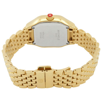 Yellow gold-plated stainless steel case and bracelet. Fixed yellow gold-plated bezel set with diamonds. Mother of pearl (diamond-set) dial with yellow gold-tone hands and diamond-set index hour markers. Dial Type: Analog. Quartz movement. Scratch resistant sapphire crystal. Pull / push crown. Solid case back. Square case shape. Case size: 29 mm. Band width: 14 mm. Butterfly clasp. Water resistant at 30 meters / 100 feet. Functions: hour, minute, second. Meggie Series. Casual watch style. Watch label: Swiss Made. Michele Meggie Quartz Diamond Mother of Pearl Dial Ladies Watch MWW33B000003.