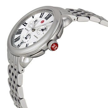 Stainless steel case with a stainless steel bracelet. Fixed stainless steel bezel. Silver-white dial with diamonds and silver-tone hands and Roman numeral hour markers. Dial Type: Analog. Luminescent hands. Date display at the 6 o'clock position, Day of the week sub-dial. Chronograph - two sub-dials displaying: 60 second and 30 minute. Swiss quartz movement. Scratch resistant sapphire crystal. Pull / push crown. Solid case back. Case diameter: 38 mm. Round case shape. Band width: 18 mm. Deployment clasp with push button. Water resistant at 50 meters / 165 feet. Functions: chronograph, day, date, hour, minute, second. Dress watch style. Michele Serein Chronograph Diamond Stainless Steel Ladies Watch MWW21A000019.
