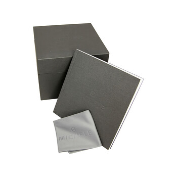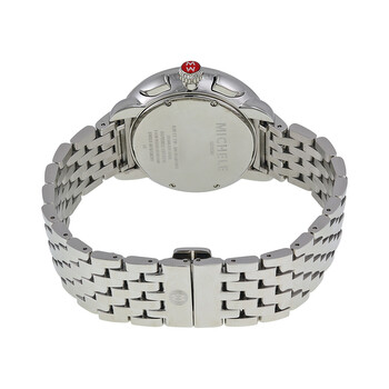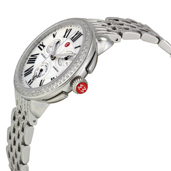 Stainless steel case with a stainless steel bracelet bracelet set with diamonds bracelet. Fixed stainless steel bezel set with diamonds. Silver dial with luminous hands and Roman numeral hour markers. Minute markers around the outer rim. Dial Type: Analog. Luminescent hands. Date display at the 6 o'clock position. Chronograph - two sub-dials displaying: 60 second and 30 minute. Day of the week sub-dial at the 6 o'clock position. Quartz movement. Scratch resistant sapphire crystal. Solid case back. Case diameter: 38 mm. Round case shape. Band width: 18 mm. Deployment clasp. Water resistant at 50 meters / 165 feet. Functions: chronograph, date, hour, minute, second. Luxury watch style. Watch label: Swiss Made. Michele Serein Diamond Silver Dial Chronograph Ladies Watch.