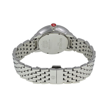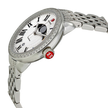 Stainless steel case with a stainless steel bracelet set with diamonds. Fixed silver-tone bezel set with diamonds. Semi matte silver and white with moon and star des dial with silver-tone hands and Roman numeral hour markers. Minute markers around the outer rim. Dial Type: Analog. Luminescent hands and markers. Date display at the 6 o'clock position. Moonphase display below the 12 o'clock position. Quartz movement. Scratch resistant sapphire crystal. Pull / push crown. Solid case back. Case dimensions: 40 mm x 38 mm. Round case shape. Band width: 18 mm. Deployment clasp. Water resistant at 30 meters / 100 feet. Functions: date, hour, minute, second, moon phases. Additional Info: moon phases, number of diamonds: 218, total diamond weight: 1.25 ct.. Luxury watch style. Watch label: Swiss Movement. Michele Serein Matte Silver White Moon and Star Dial Diamond Stainless Steel Bracelet Ladies Watch MWW21D000001.