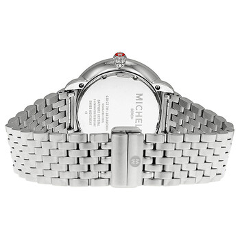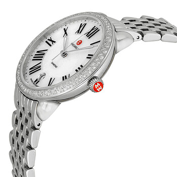 Stainless steel case with a stainless steel bracelet. Fixed silver-tone bezel set with 88 diamonds. Mother of pearl dial with gold-tone hands and Roman numeral hour markers. Minute markers around the outer rim. Dial Type: Analog. Date display at the 6 o'clock position. Quartz movement. Scratch resistant sapphire crystal. Pull / push crown. Solid case back. Case diameter: 36 mm. Case thickness: 8.5 mm. Round case shape. Deployment clasp with push button release. Water resistant at 50 meters / 165 feet. Functions: date, hour, minute, second. Dress watch style. Michele Serein Mother of Pearl Dial Stainless Steel Ladies Watch MWW21B000001