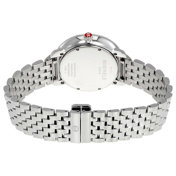 Silver-tone stainless steel case with a silver-tone stainless steel bracelet. Fixed silver-tone stainless steel bezel. Pink dial with silver-tone hands and Roman numeral hour markers. Minute markers around the outer rim. Dial Type: Analog. Date display at the 6 o'clock position. Quartz movement. Scratch resistant sapphire crystal. Pull / push crown. Solid case back. Case size: 36 mm x 34 mm. Oval case shape. Deployment clasp. Water resistant at 50 meters / 165 feet. Functions: date, hour, minute, second. Dress watch style. Watch label: Swiss Made. Michele Serein Pink Dial Diamond Ladies Watch MWW21B000115.