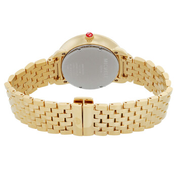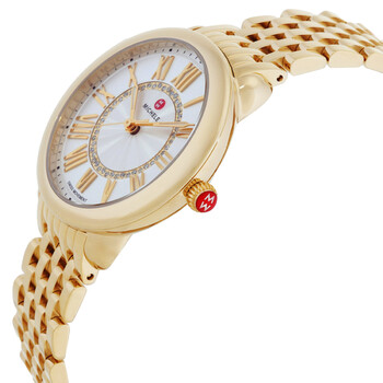 Yellow gold-tone stainless steel case and bracelet. Fixed yellow gold-tone stainless steel bezel. Silver-tone dial with yellow gold-tone hands and Roman numeral hour markers. Minute markers around the outer rim. Dial Type: Analog. Quartz movement. Scratch resistant sapphire crystal. Round case shape, case size: 36 mm. Fold over clasp with a safety release. Functions: hour, minute, second. Serein Series. Casual watch style. Watch label: Swiss Made. Michele Serein Quartz Silver Dial Ladies Watch MWW21B000160.