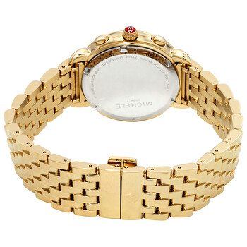 Gold-plated stainless steel case and bracelet. Fixed gold-plated bezel set with diamonds. Mother of pearl dial with luminous gold-tone hands and diamond hour markers. Minute markers around the outer rim. Dial Type: Analog. Luminescent hands and markers. Date display at the 6 o'clock position. Chronograph - three sub-dials displaying: 60 second, 30 minute and 12 hours. Quartz movement. Scratch resistant sapphire crystal. Pull / push crown. Solid case back. Round case shape. Case size: 38 mm. Case thickness: 11 mm. Band width: 18 mm. Fold over clasp with a push button release. Water resistant at 50 meters / 165 feet. Functions: chronograph, date, hour, minute, second. Additional Info: in general, suitable for short periods of recreational swimming, but not diving or snorkeling. Dress watch style. Watch label: Swiss Made. Michele Sidney Chronograph Diamond Ladies Watch MWW30A000008.