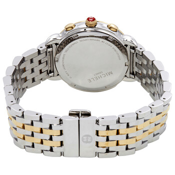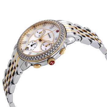 Stainless steel case with a two-tone (silver-tone and 18kt yellow gold-tone) stainless steel bracelet. Fixed 18kt yellow gold-tone bezel set with diamonds. Mother of pearl dial with luminous gold-tone hands and diamond-set index hour markers. Minute markers around the outer rim. Dial Type: Analog. Luminescent hands. Date display at the 6 o'clock position. Chronograph - three sub-dials displaying: 60 second, 30 minute and 12 hour. Quartz movement. Scratch resistant sapphire crystal. Solid case back. Round case shape. Case size: 38 mm. Case thickness: 11 mm. Band width: 18 mm. Fold over clasp with a push button release. Water resistant at 50 meters / 165 feet. Functions: chronograph, date, hour, minute, second. Sidney Series. Dress watch style. Watch label: Swiss Made. Michele Sidney Chronograph Mother of Pearl Dial Ladies Watch MWW30A000005.