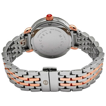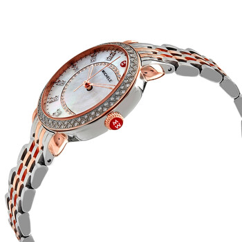 Stainless steel case with a two-tone (silver-tone and rose gold-plated) stainless steel bracelet. Fixed rose gold-plated bezel set with 150 diamonds. Mother of pearl (diamond-set) dial with luminous rose gold-tone hands and diamond hour markers. Minute markers around the outer rim. Dial Type: Analog. Luminescent hands. Quartz movement. Scratch resistant sapphire crystal. Pull / push crown. Solid case back. Round case shape. Case size: 33 mm. Band width: 14 mm. Fold over clasp with a push button release. Water resistant at 50 meters / 165 feet. Functions: hour, minute, second. Additional Info: 150 hand-set diamonds on the bezel (.59 ct). Sidney Classic Series. Dress watch style. Michele Sidney Classic Mother of Pearl Dial Two-tone Ladies Watch MWW30B000003.