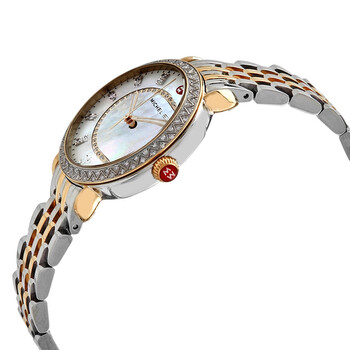 Stainless steel case with a two-tone (silver-tone and gold-plated ) stainless steel bracelet. Fixed gold-plated bezel set with diamonds. White mother of pearl (diamond-set) dial with luminous gold-tone hands and diamond hour markers. Minute markers around the outer rim. Dial Type: Analog. Luminescent hands. Quartz movement. Scratch resistant sapphire crystal. Pull / push crown. Solid case back. Round case shape. Case size: 33 mm. Band width: 14 mm. Fold over clasp with a push button release. Water resistant at 50 meters / 165 feet. Functions: hour, minute, second. Sidney Classic Series. Dress watch style. Michele Sidney Classic White Mother of Pearl Diamond Dial Ladies Watch MWW30B000002.