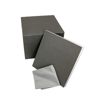 Gold-plated stainless steel case with a red leather strap. Fixed stainless steel bezel set with diamonds. Mother of pearl dial with gold-tone hands and diamond hour markers. Minute markers around the outer rim. Dial Type: Analog. Luminescent hands. Date display at the 6 o'clock position. Chronograph - three sub-dials displaying: 60 second, 30 minute and day of the week. Quartz movement. Scratch resistant sapphire crystal. Solid case back. Case diameter: 36 mm. Round case shape. Band width: 18 mm. Tang clasp. Water resistant at 50 meters / 165 feet. Functions: chronograph, date, day of the week, hour, minute, second. Watch label: Swiss Made. Michele Signature CSX Mother of Pearl Dial Leather Ladies Watch MWW03M000145.