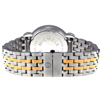 Stainless steel case with a two-tone (silver and gold-tone) stainless steel bracelet. Fixed gold-tone bezel set with diamonds. Mother of pearl dial with gold-tone hands and diamond hour markers. Minute markers around the outer rim. Dial Type: Analog. Luminescent hands and markers. Date display at the 6 o'clock position. Chronograph - three sub-dials displaying: 60 second, 30 minute and day of the week. Quartz movement. Scratch resistant sapphire crystal. Red michele logo pull / push crown. Solid case back. Case diameter: 36 mm. Round case shape. Band width: 18 mm. Deployment clasp with push button release. Water resistant at 50 meters / 165 feet. Casual watch style. Watch label: Swiss Made. Michele Signature CSX-36 Two-tone Stainless Steel Watch MWW03M000164.
