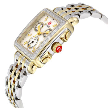 Two-tone (silver and yellow gold-plated ) stainless steel case with a two-tone (silver and yellow gold-plated ) stainless steel bracelet. Fixed yellow gold-plated bezel set with 120 diamonds (0.66 ct). Mother of pearl dial with luminous yellow gold-tone hands and diamond index hour markers. Minute markers around the outer rim. Dial Type: Analog. Luminescent hands and markers. Date display at the 6 o'clock position. Day of the week sub-dial. Chronograph - two sub-dials displaying: 60 second and 30 minute. Quartz movement. Scratch resistant sapphire crystal. Pull / push crown. Solid case back. Rectangle case shape. Case dimensions: 35 mm x 33 mm. Case thickness: 10.5 mm. Band width: 18 mm. Deployment clasp with a push button release. Water resistant at 50 meters / 165 feet. Functions: chronograph, day, date, hour, minute, second. Additional Info: suitable for swimming and showering. Dress watch style. Watch label: Swiss Movement. Michele Signature Deco Chronograph Diamond Ladies Watch MWW06P000108.