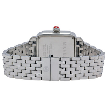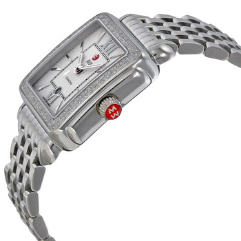 Stainless steel case with a stainless steel bracelet. Fixed silver-tone bezel set with 108 diamonds (0.6 ct). Silver guilloche dial with silver-tone hands and index hour markers. Roman numerals mark the 6 and 12 o'clock positions. Minute markers around an inner ring. Dial Type: Analog. Luminescent hands and markers. Date display at the 6 o'clock position. Swiss quartz movement. Scratch resistant sapphire crystal. Pull / push crown. Solid case back. Case dimensions: 33 mm x 35 mm. Case thickness: 10.5 mm. Rectangle case shape. Band width: 18 mm. Deployment clasp with push button. Water resistant at 50 meters / 165 feet. Functions: date, hour, minute, second. Dress watch style. Michele Signature Deco Diamond Silver Guilloche Dial Steel Ladies Watch MWW06T000055.