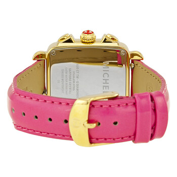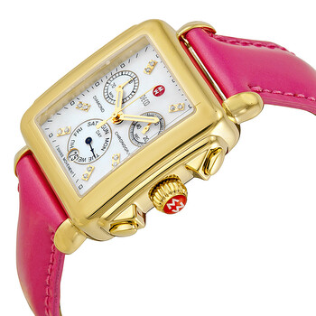 Gold-tone stainless steel case with a pink (patent) leather strap. Fixed gold-tone bezel. White mother of pearl dial with gold-tone hands and index hour markers. Diamond-set index markers at the 1, 4, 5, 7, 8 and 11 o'clock positions. Minute markers around the outer rim. Dial Type: Analog. Luminescent hands and markers. Date display at the 6 o'clock position. Chronograph - two sub-dials displaying: 60 second and 30 minute. Day of the week sub-dial at the 6 o'clock position. Quartz movement. Scratch resistant sapphire crystal. Solid case back. Case dimensions: 33 mm x 35 mm. Rectangle case shape. Band width: 18 mm. Tang clasp. Water resistant at 50 meters / 165 feet. Functions: chronograph, date, hour, minute, second. Additional Info: the pink patent leather strap is interchangeable with any 18mm michele strap. Luxury watch style. Michele Signature Deco Mother of Pearl Dial Gold-tone Pink Leather Ladies Watch MWW06P000133.