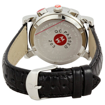 Stainless steel case with a black alligator bracelet. Stainless steel bezel set with 96 diamonds. White dial with silver-tone hands and index hour markers. Minute markers around the outer rim. Date display at the 6 o'clock position. Chronopgraph - three sub-dials displaying: 60 Seconds, 30 Minutes and 1/10th of a Second Quartz movement. Scratch resistant scratch resistant sapphire crystal. Case diameter: 38mm. Water resistant at 50 meters (165 feet). Michele Sport Sail Steel Diamond Ladies Watch MWW01C000005.