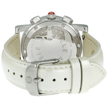 Silver-tone stainless steel case with a silver patent leather strap. Fixed coin edge silver-tone 96 diamonds (0.46 carats) bezel. White enamel dial with luminous hands and index hour markers. Minute markers around the outer rim. Dial Type: Analog. Luminescent hands. Date display at the 6 o'clock position. Chronograph - three sub-dials displaying: 60 second, 30 minute and 1/10th of a second. Quartz movement. Scratch resistant sapphire crystal. Pull / push crown. Solid case back. Round case shape, case size: 38 mm, case thickness: 11 mm. Band width: 20 mm. Tang clasp. Water resistant at 50 meters / 165 feet. Functions: hours, minutes, seconds, date, chronograph. Sport Stail Series. Sport watch style. Watch label: Swiss. Michele Sport Sail White Dial Chronograph Ladies Watch MWW01C000010.