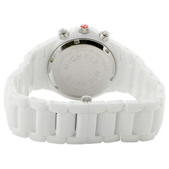 White ceramic case with a white ceramic bracelet. Fixed stainless steel bezel set with diamonds. White dial with silver-tone hands and Arabic numeral hour markers. Minute markers around the outer rim. Date display at the 6 o'clock position. Chronograph - three sub-dials displaying: 1/10th seconds, 30 minutes and 60 seconds. Quartz movement. Scratch resistant mineral crystal. Push / pull crown. Solid case back. Case diameter: 40mm. Case thickness: 13.2 mm Deployment clasp. Water resistant at 50 meters / 165 feet. Functions: hours, minutes, seconds, calendar, chronograph. Michele Tahitian Ceramic White Diamond 36mm Ladies Watch MWW12B000001.