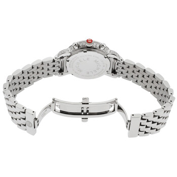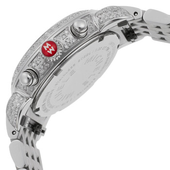 Stainless steel case with a stainless steel bracelet set with diamonds. Fixed stainless steel bezel set with diamonds. Mother of pearl dial with silver-tone hands and diamond hour markers. Dial Type: Analog. Chronograph - two sub-dials displaying: 60 second and 30 minute. Day of the week sub-dial at the 6 o'clock position. Quartz movement. Scratch resistant sapphire crystal. Solid case back. Case diameter: 33 mm. Round case shape. Band width: 16 mm. Deployment clasp. Water resistant at 50 meters / 165 feet. Dress watch style. Michele Tahitian Chronograph Mother of Pearl Dial Stainless Steel Ladies Watch MWW03S000001.