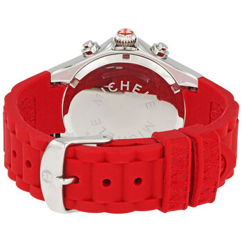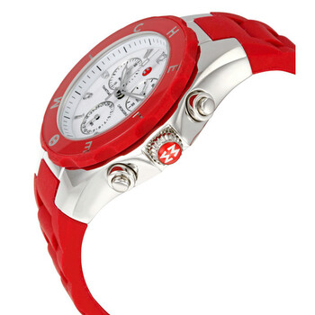 Stainless steel case with a red rubber strap. Fixed red bezel. White enamel dial with luminous hands and Arabic hour markers. Minute markers around the outer rim. Three sub-dials displaying: date, 30 minutes, and 60 seconds. Quartz chronograph movement. Scratch resistant mineral crystal. Push in crown. Screw-in case back. Case diameter: 40 mm. Tang clasp. Water resistant at 50 meters/165 feet. Functions: hours, minutes, seconds, calendar, chronograph. Michele Tahitian Jelly Bean Large Red Chronograph Ladies Watch MWW12F000021.