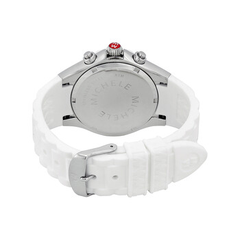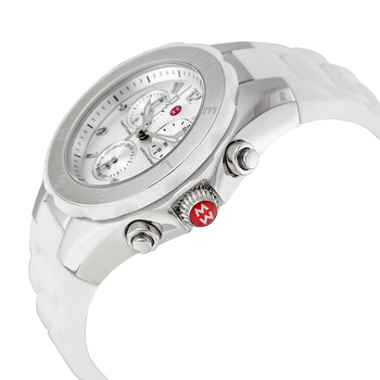 Stainless steel case with a white silicone strap. Fixed stainless steel bezel with white enamel top ring. Silver dial with silver-tone hands and Arabic numeral hour markers. Minute markers around the outer rim. Dial Type: Analog. Luminescent hands and markers. Chronograph - two sub-dials displaying: 60 second and 30 minute. Date sub-dial at the 6 o'clock position. Quartz movement. Scratch resistant mineral crystal. Solid case back. Case diameter: 40 mm. Case thickness: 12 mm. Round case shape. Band width: 23 mm. Tang clasp. Water resistant at 50 meters / 165 feet. Functions: chronograph, date, hour, minute, second. Dress watch style. Michele Tahitian Jelly Bean Silver Dial White Silicone Ladies Watch MWW12F000032.