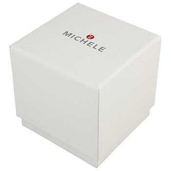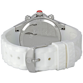 Stainless steel case with a white rubber strap. Fixed white rubber covered bezel. White dial with luminous hands and multi-colored Arabic numeral hour markers. Minute markers around the outer rim. Dial Type: Analog. Luminescent hands and markers. Chronograph - three sub-dials displaying: 60 seconds, 30 minutes and date. Quartz movement. Scratch resistant sapphire crystal. Push in crown. Solid case back. Case diameter: 40 mm. Case thickness: 12 mm. Band width: 20 mm. Tang clasp. Water resistant at 50 meters / 165 feet. Functions: hours, minutes, seconds, chronograph, date. Casual watch style. Michele Tahitian Jellybean Chronograph Large White Carousel Ladies Watch MWW12F000013.