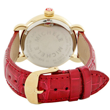 Gold-tone stainless steel case with a red leather strap. Fixed black diamond set bezel. Graphic dial with luminous gold-tone hands and diamonds hour markers. Dial Type: Analog. Date display at the 6 o'clock position. Quartz movement. Scratch resistant sapphire crystal. Stainless steel, fluted with mw logo crown. Solid case back. Round case shape. Case size: 36 mm. Buckle clasp. Water resistant at 50 meters / 165 feet. Functions: date, hour, minute, second. Dress watch style. Watch label: Swiss. Michele Tropical Paradise Toucan Watch MWW05C000004.