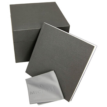 Stainless steel case with a espresso leather bracelet. Fixed stainless steel bezel set with 116 diamonds. White dial with luminous hands and black Arabic numeral hour markers hour markers. Minute markers on the outer rim. Luminescent hands and dial markers. Seconds sub-dial appears at the 6 o'clock position. Quartz movement. Scratch resistant sapphire crystal. Push in crown. Screwed down solid case back. Case dimensions: 29 mm x 35 mm. Tang clasp. Water resistant at 50 meters (165 feet). Michele Urban Mini Diamond Watch MWW02A000042.