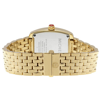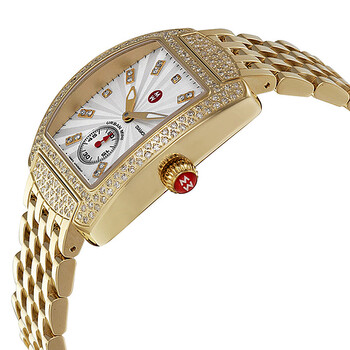 18kt gold-plated stainless steel case and bracelet. Fixed 18kt gold-plated bezel set with diamonds. Silver and white guilloche diamond dial with gold-tone hands and diamond-set index hour markers. Minute markers around the outer rim. Dial Type: Analog. Luminescent hands and markers. Second sub-dial at 6 o'clock position. Quartz movement. Scratch resistant sapphire crystal. Pull / push crown. Solid case back. Case dimensionsr: 29 mm x 35 mm. Tonneau case shape. Water resistant at 50 meters / 165 feet. Functions: hour, minute, second. Additional Info: number of diamonds: 187, total diamond weight: 1.04 ct.. Luxury watch style. Watch label: Swiss Made. Michele Urban Mini Silver and White Diamond Dial Gold-Plated Stainless Steel Bracelet Ladies Watch MWW02A000565.