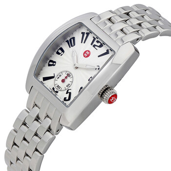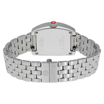 Stainless steel case with a stainless steel bracelet. Fixed stainless steel bezel. Silver dial with luminous silver-tone hands and Arabic numeral hour markers. Minute markers around the outer rim. Dial Type: Analog. Luminescent hands. Small seconds sub-dial. Quartz movement. Scratch resistant mineral crystal. Solid case back. Case size: 28 mm. Case thickness: 8 mm. Tonneau case shape. Band width: 16 mm. Deployment clasp with a push button release. Water resistant at 50 meters / 165 feet. Functions: hour, minute, second. Casual watch style. Michele Urban Mini Silver Dial Ladies Watch MWW02A000602.