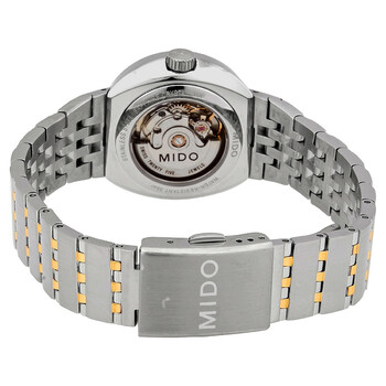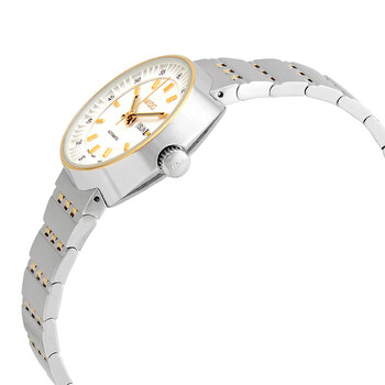 Stainless steel case with a two-tone (silver-tone and gold-tone) stainless steel bracelet. Fixed silver-tone and gold-tone bezel. White dial with luminous gold-tone hands and index hour markers. Arabic numeral minute markers (at 5 minute intervals) around the outer rim. Dial Type: Analog. Luminescent hands. Day of the week and date display at the 3 o'clock position. Automatic movement. Scratch resistant sapphire crystal. Pull / push crown. Transparent case back. Round case shape. Case size: 30 mm. Case thickness: 9.55 mm. Fold over clasp. Water resistant at 50 meters / 165 feet. Functions: date, day, hour, minute, second. All Dial Series. Casual watch style. Watch label: Swiss Made. Mido All Dial Automatic White Dial Ladies Watch M733091112.