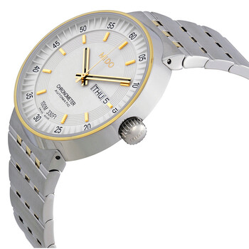 Stainless steel case with a two-tone (silver-tone and gold PVD) stainless steel bracelet. Fixed stainless steel bezel with a gold PVD ring. White cream dial with luminous gold-tone hands and index hour markers. Arabic numeral minute markers (at 5 minute intervals). Minute markers around the outer rim. Dial Type: Analog. Luminescent hands. Day of the week and date display at the 3 o'clock position. ETA caliber 2836-2 automatic movement, based upon ETA 2824-2, containing 25 Jewels, bitting at 28800 vph, and has a power reserve of approximately 40 hours. Scratch resistant sapphire crystal. Skeleton case back. Round case shape. Case size: 40 mm. Case thickness: 10 mm. Band width: 20 mm. Band length: 8.5 inches. Fold over clasp with a safety release. Water resistant at 100 meters / 330 feet. Functions: date, day, hour, minute, second. All Dial Series. Casual watch style. Watch label: Swiss Made. Item Variations: M83409B111. Mido All Dial Chronometer Automatic White Cream Dial Two-tone Men's Watch M83409B111.