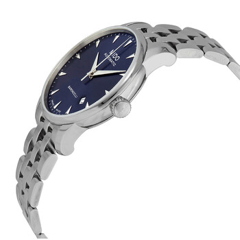 Stainless steel case with a stainless steel bracelet. Fixed stainless steel bezel. Blue dial with silver-tone dauphine-style hands and index hour markers. Minute markers around the outer rim. Dial Type: Analog. Date display between the 4 and 5 o'clock positions. Mido calibre Powermatic 80 (ETA C07.611) automatic movement, based upon ETA 2824-2, containing 23 Jewels, bitting at 21600 vph, and has a power reserve of approximately 80 hours. Scratch resistant sapphire crystal. Transparent case back. Round case shape. Case size: 38 mm. Case thickness: 9.1 mm. Band width: 20 mm. Deployment clasp. Water resistant at 50 meters / 165 feet. Functions: date, hour, minute, second. Casual watch style. Watch label: Swiss Made. Mido Automatic Blue Dial Stainless Steel Men's M86004151.