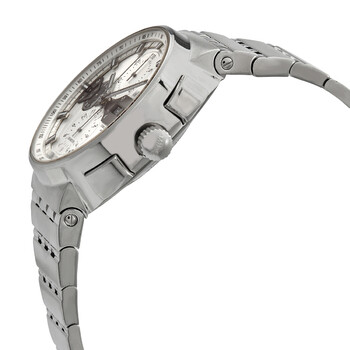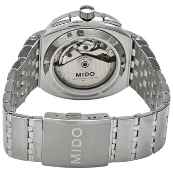 Stainless steel case with a stainless steel bracelet. Fixed stainless steel bezel. Silver dial with luminous silver-tone hands and index hour markers. Minute markers. Tachymeter scale around the outer rim. Dial Type: Analog. Luminescent hands and markers. Day of the week and date display at the 3 o'clock position. Chronograph - three sub-dials displaying: 60 second, 30 minute and 12 hour. Automatic movement. Scratch resistant sapphire crystal. Screw down crown. Transparent case back. Round case shape. Case size: 44 mm. Case thickness: 10 mm. Band width: 22 mm. Fold over clasp with a safety release. Water resistant at 100 meters / 330 feet. Functions: chronometer, date, day, hour, minute, second. Sport watch style. Watch label: Swiss Made. Mido Automatic Chronometer Silver Dial Men's Watch M0066151103100.