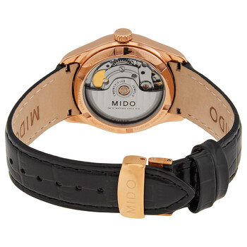 Rose gold-tone stainless steel case with a black leather strap. Fixed rose gold-tone bezel. White dial with rose gold-tone hands and diamond hour markers. Date scale around an inner ring. Dial Type: Analog. Automatic movement. Scratch resistant sapphire crystal. Pull / push crown. Solid case back. Round case shape. Case size: 33 mm. Case thickness: 10 mm. Band width: 18 mm. Tang clasp. Water resistant at 50 meters / 165 feet. Functions: date, hour, minute, second. Dress watch style. Watch label: Swiss Made. Mido Automatic Diamond White Dial Ladies Watch M0242073603600.