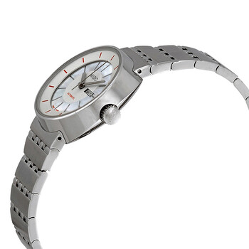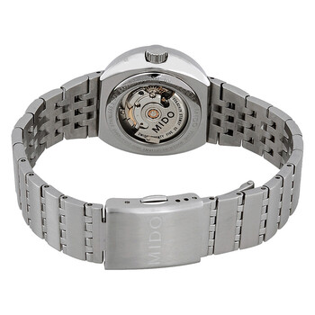 Silver-tone stainless steel case with a silver-tone stainless steel bracelet. Fixed silver-tone stainless steel bezel. Mother of pearl dial with silver-tone hands and index hour markers. Dial Type: Analog. Day of the week and date display at the 4 o'clock position. Automatic movement. Scratch resistant sapphire crystal. Transparent case back. Round case shape. Case size: 30 mm. Water resistant at 50 meters / 165 feet. Functions: date, day, hour, minute, second. Casual watch style. Watch label: Swiss Made. Mido Automatic Mother of Pearl Ladies Watch M733041912.