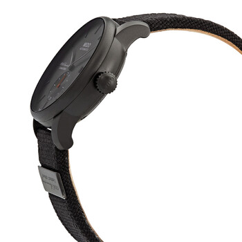 Black PVD stainless steel case with a black fabric (leather backed) strap. Fixed blackPVD bezel. Anthracite dial with black hands and index hour markers. Dial Type: Analog. Date display at the 3 o'clock position. One subdial displaying: small seconds. ETA caliber 2825-2 automatic movement, based upon ETA 2824-2, containing 25 Jewels, bitting at 28800 vph, and has a power reserve of approximately 42 hours. Scratch resistant sapphire crystal. Pull / push crown. Transparent case back. Round case shape. Case size: 38 mm. Band width: 20 mm. Water resistant at 50 meters / 165 feet. Functions: date, hour, minute, small second. Baroncelli 100th Anniversary Limited Edition Series. Casual watch style. Watch label: Swiss Made. Mido Baroncelli 100th Anniversary Limited Edition Automatic Men's Watch M8608.3.18.9.