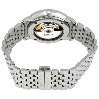 Stainless steel case and bracelet. Fixed stainless steel bezel. Blue dial with silver-tone dauphine-style hands and index hour markers. Minute markers around the outer rim. Dial Type: Analog. Date display at the 3 o'clock position. Mido calibre Powermatic 80 COSC (base ETA C07.621 automatic movement, based upon ETA C07.621, containing 25 Jewels, bitting at 21600 vph, and has a power reserve of approximately 80 hours. Scratch resistant sapphire crystal. Transparent case back. Round case shape, case size: 40 mm, case thickness: 9.43 mm. Band width: 22 mm. Fold over clasp. Water resistant at 30 meters / 100 feet. Functions: date, hour, minute, second, chronometer. Baroncelli Series. Casual watch style. Watch label: Swiss Made. Mido Baroncelli Automatic Blue Dial Men's Watch M027.408.11.041.00.
