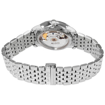 Stainless steel case with a stainless steel bracelet. Fixed stainless steel bezel. White dial with silver-tone hands and diamond hour markers. Roman numerals appear at the 3, 6, 9 and 12 o'clock positions. Minute markers around the outer rim. Dial Type: Analog. Date display at the 3 o'clock position. Mido caliber 80 COSC Si (base ETA C07.821) automatic movement, containing 25 Jewels, bitting at 21600 vph, and has a power reserve of approximately 80 hours. Scratch resistant sapphire crystal. Pull / push crown. Transparent case back. Round case shape. Case size: 34 mm. Case thickness: 9.1 mm. Band width: 18 mm. Fold over clasp with a safety release. Water resistant at 30 meters / 100 feet. Functions: date, day, hour, minute, second, chronometer. Additional Info: 8 diamond markers with 0.0168ct. Baroncelli Series. Dress watch style. Watch label: Swiss Made. Mido Baroncelli Automatic Chronometer Diamond White Dial Ladies Watch M027.208.11.016.00.