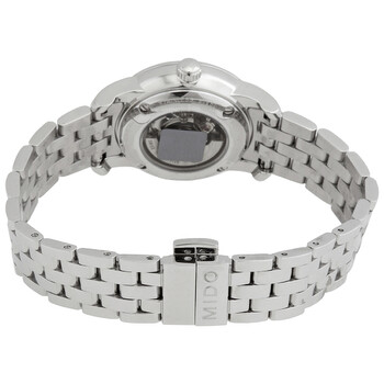 Stainless steel case with a stainless steel bracelet. Fixed stainless steel bezel. Rhodium dial with rose gold-tone hands and diamond hour markers. Minute markers around the outer rim. Dial Type: Analog. Date display between the 4 and 5 o'clock positions. ETA 2671 automatic movement with a 44 h power reserve. Scratch resistant sapphire crystal. Pull / push crown. Transparent case back. Round case shape. Case size: 29 mm. Case thickness: 8.7 mm. Band width: 15 mm. Deployment clasp with a push button release. Water resistant at 50 meters / 165 feet. Functions: date, hour, minute, second. Baroncelli Series. Dress watch style. Watch label: Swiss Made. Mido Baroncelli Automatic Diamond Ladies Watch M76004671.